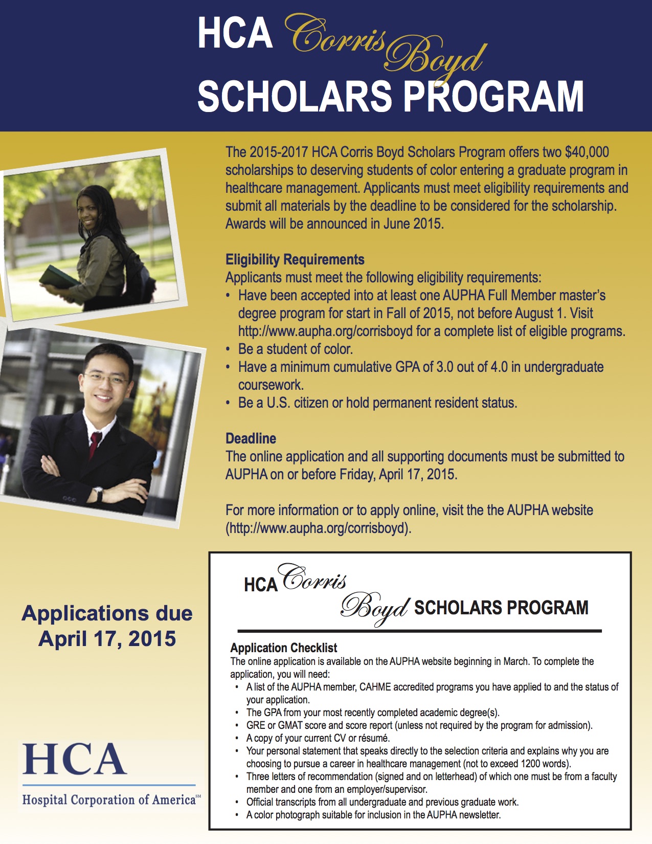HCA and AUPHA are pleased to announce that the HCA Corris Boyd Scholars Program is now accepting applications for the 2015-2017 Scholarship. If your program has applicants that meet the below eligibility, please provide them with this scholarship information.